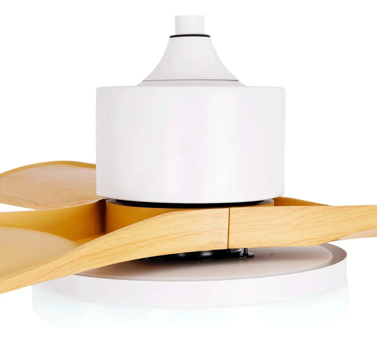 Con aspas símil madera y luz LED tricolor, combina estilo y confort en cualquier ambiente.